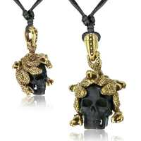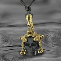Description: Necklace with brass and hand carved wood skull pendant