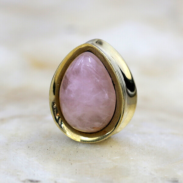 Description: Brass teardrop plug with Rose Quartz