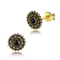 Are you looking for a brass earring that is small but that would stand out on your ears? This is the perfect combination of that. This brass stud would be small on your ears but will definitely stand out because of the colour and how it looks. This tribal jewellery is in the shape of a lotus and gold in colour, but our artisans added an onyx stone in the centre of the organic brass stud just so it stands out even more.