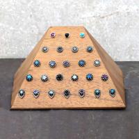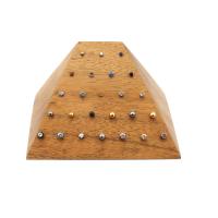 Slope shaped body piercing jewelry display made from Suar wood. 25 holes suitable for Threadless piercing ends. Engraved with Threadless Piercing on the bottom part.