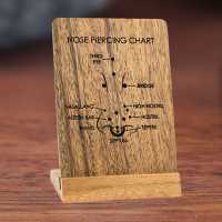 Engraved Nose piercing chart display made from natural colored Suar wood that clearly shows all the varieties of body piercings usually done in the nose area. Knock-down system wooden jewelry display tray for convenient shipping, easy to assemble.