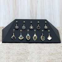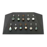 Slope shaped body piercing jewelry display made from coffee coloured Suar wood. Eleven clips suitable for navel bars or straight body piercing bars.
