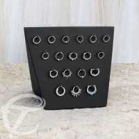 Body piercing jewelry display stand made from coffee coloured Suar wood. 18 clips suitable for circular piercing bars or segment rings.