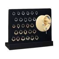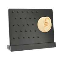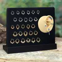 Wooden jewelry display with 27 clips to hang hinged segment rings, BCR's or circular barbells. Comes with a silicone ear used to easily showcase the piercing jewelry. Knock-down system jewelry display tray made from coffee colored Suar wood.
