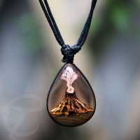 A volcano hand-carved from Teak wood makes the base for this explosive wooden epoxy necklace. The wood base epoxy resin jewelry is encased in resin with an orange hue and the ash cloud is hand painted to complete this amazing resin pendant.