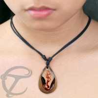 Amber coloured resin with a darker flame effect embedded in a hand carved teak wood pendant that we burn a little makes up this hot epoxy necklace. Another innovative epoxy resin pendant design from our wholesale resin jewelry assortment.