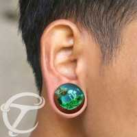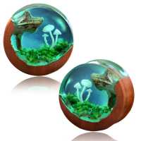 Hand-carved Saba wood is making the base for this mystic epoxy wood plug. The moss and mushroom inside the epoxy plug is all set by hand making this a truly exclusive piece of body piercing jewelry.