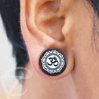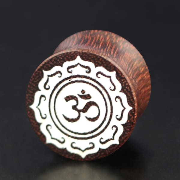 Description: Tamarind Om wood plug with bone inlay.