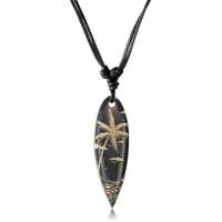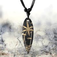 A crocodile wood surf board pendant that we colour black then engrave with a beach and coco palm for the ultimate tropical surf jewelry feel. Don't miss out on this surf board necklace.
