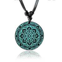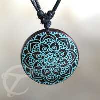 A wood pendant engraved with a intricate mandala jewelry design then inlayed with a crushed turquoise stone necklace. Available in our organic jewelry wholesale collection.