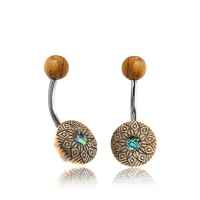 Engraved olive wood navel bar piercing with abalone inlay. Bringing together organic body jewelry and steel body piercings.
