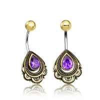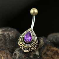 This navel piercing is casted from high quality brass that our talented smiths set with a teardrop shaped synthetic amethyst by hand. This brass navel bar is also available as a silver navel piercing in our wholesale steel piercing collection.