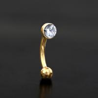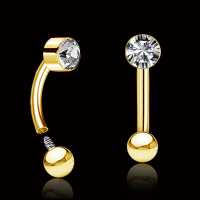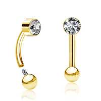 A simple PVD gold coated 1.2mm curved bar with a zirconia crystal cup welded to one end and a internally threaded steel piercing ball on the other end. This steel body jewelry style can be used as either rook piercing or as an eyebrow piercing.