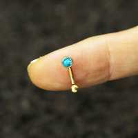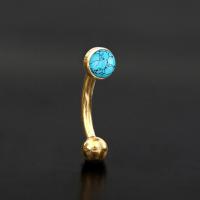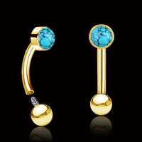 This style of PVD gold-coated eyebrow piercing designs are much liked among our wholesale steel body jewelry buyers. Here is a beautiful curved steel piercing bar set with a synthetic turquoise cabochon. A real eye-catcher either as a rook piercing or worn as eyebrow jewelry.