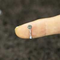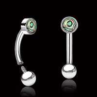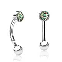 This style of surgical steel eyebrow piercing design is very well liked among our wholesale steel body jewelry customers. Our line of curved steel piercing bars featuring semi precious stones and shells such as this abalone inlay are very elegant to be worn as either rook piercing or eyebrow jewelry.