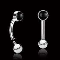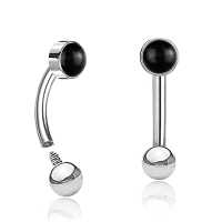 This style of eyebrow piercing models are very popular among our wholesale steel body jewelry enthusiasts. Our selection of curved steel piercing bars set with semi precious stone such as this shiny black onyx cabochon, are very eye catching when worn as either rook piercing or eyebrow jewelry.