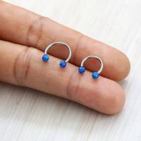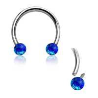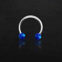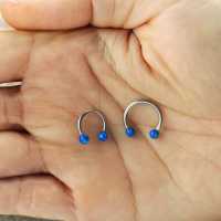 A 316L circular steel barbell with two blue synthetic opals makes this steel body jewelry an excellent option for an ear piercing such as a conch piercing, helix piercing or even a snug piercing. Can also be used as a septum piercing in the nose.
