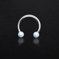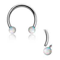 A 316L circular steel barbell with two white synthetic opals balls makes this steel body jewelry an stunning option for an ear piercing such as a conch piercing, helix piercing or even a snug piercing. Can also be worn as a septum piercing in the nose.