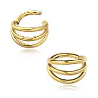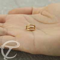 A PVD gold coated steel piercing segment ring with three ring attachments. Ideal to be worn as conch piercing, tragus piercing as well as helix piercing and lip piercing just to give a few good ideas.
