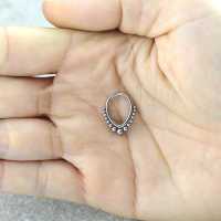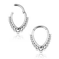 A very unique teardrop shaped steel hinged segment ring that have been hand crafted using our steel piercing cluster technique. These steel body jewelry are great to use as septum piercing, tragus piercing as well as snug piercing.