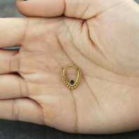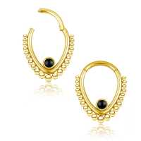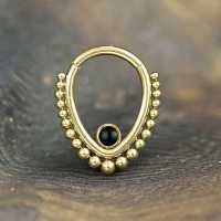 This PVD gold plated teardrop shaped steel hinged segment ring is set with a black onyx cabochon. This is all welded by hand using our exclusive steel piercing cluster procedure. This type of steel body jewelry is great to be worn as snug piecing, helix piercing as well as septum piercing just to give a few cool ideas to express your style with our body jewelry.