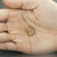 This teardrop shaped PVD gold plated hinged segment ring is decorated with a white synthetic opal. We weld this by hand using a steel piercing cluster method. This type of steel body jewelry is perfect to be used as snug piecing, helix piercing as well as septum piercing.