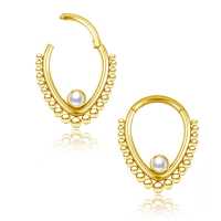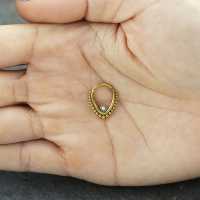 This teardrop shaped PVD gold plated hinged segment ring is adorned with a white synthetic pearl cabochon. Hand welded by our steel jewelry workers using a steel piercing cluster technique. This type of steel body jewelry is perfect to be used as daith piecing, rook piercing as well as nose piercing.