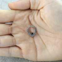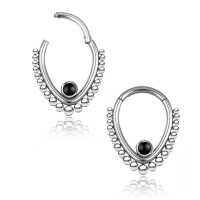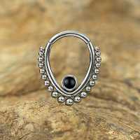 This teardrop shaped steel hinged segment ring is made using a black onyx cabochon. We weld this by hand using our exclusive steel piercing cluster method. This type of steel body jewelry is ideal to be used as snug piecing, helix piercing as well as septum piercing just to mention a few cool ways to express your style with our body jewelry.