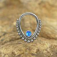 This teardrop shaped steel hinged segment ring is made using a blue synthetic opal. We create this by hand using a steel piercing cluster welding method. This type of steel body jewelry is perfect to be used as snug piecing, helix piercing as well as septum piercing just to mention a few options.