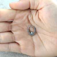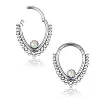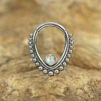 This teardrop shaped steel hinged segment ring is made using a white synthetic opal. We weld this by hand using a steel piercing cluster method. This type of steel body jewelry is perfect to be used as snug piecing, helix piercing as well as septum piercing just to mention a few cool ways to express yourself with our body jewelry.