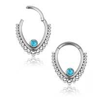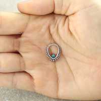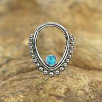This teardrop shaped steel hinged segment ring is made using synthetic turquoise cabochon. We hand weld this using our intricate steel piercing cluster method. This type of steel body jewelry is ideal to be used as snug piecing, helix piercing as well as septum piercing. These are just a few cool ways to express yourself with our body jewelry.