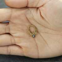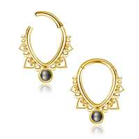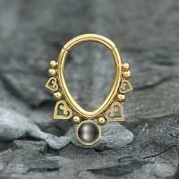 This PVD gold plated teardrop shaped steel hinged segment ring is set with a synthetic black pearl cabochon and hand-welded using a few steel hearts and steel piercing balls. This form of steel body jewelry is usually worn as snug piecing, helix piercing as well as septum piercing just to give a few cool ideas to express yourself with our body jewelry.