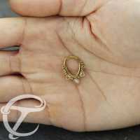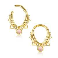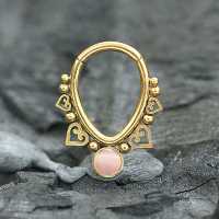 This PVD gold plated teardrop shaped steel hinged segment ring is set with a rose color cat eye cabochon and welded by hand by our steel jewelry workers. This type of steel body jewelry is great to be worn as daith piecing, helix piercing as well as septum piercing.