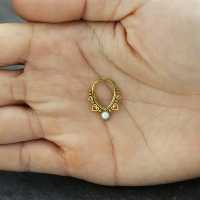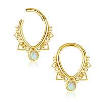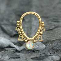 This teardrop shaped PVD gold plated hinged segment ring is decorated with a white synthetic opal. We weld this by hand using steel piercing balls and a few small steel hearts. This type of steel body jewelry is perfect to be used as snug piecing, helix piercing as well as septum piercing.