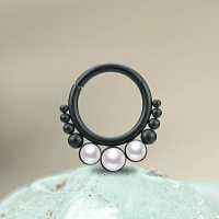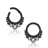 These PVD shiny black coated hinged segment rings with synthetic white pearl cabochons are expertly hand welded by our steel cluster piercing experts to make this cool steel body jewelry design. Hypo allergenic material like this is ideal as snug piercing, tragus piercing as well as septum piercing.