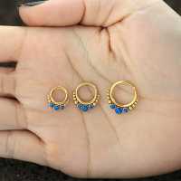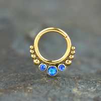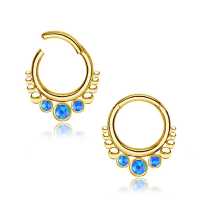 These PVD gold plated steel hinged segment ring with synthetic blue opals have been crafted by our patient steel cluster piercing welders to create truly unique steel body jewelry designs. Comfy to be used as snug piercing, tragus piercing as well as septum piercing, so if you are searching to improve on your steel body piercing wholesale collection you're in the right place.
