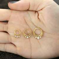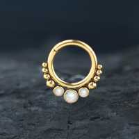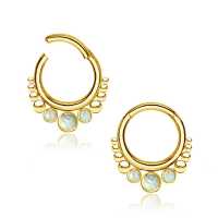 These PVD gold coated steel hinged segment ring with synthetic white opals have been carefully made by our steel cluster piercing artisans to produce a truly stunning steel body jewelry design. Absolutely perfect to be worn as snug piercing, tragus piercing as well as septum piercing, so if you are hoping to add to your steel body piercing wholesale assortment then this is the right website for you.