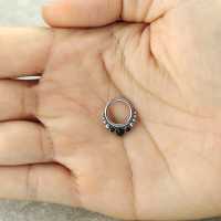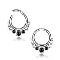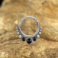 These 316L steel hinged segment ring with black onyx cabochons have been carefully hand welded by our steel cluster piercing smiths in order to produce a truly amazing steel body jewelry design. Absolutely safe to be used as snug piercing, tragus piercing as well as septum piercing, so if you are searching for some new designs for your steel body piercing wholesale assortment you have come to the right place.