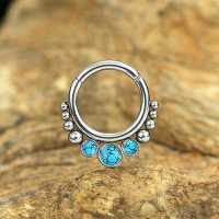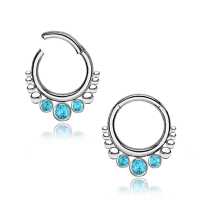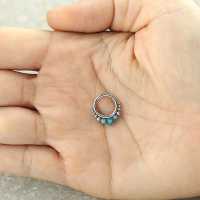 These 316L steel hinged segment ring with synthetic turquoise cabochons have been hand carefully welded by our steel cluster piercing artisans to produce a truly stunning steel body jewelry design. Absolutely safe to be used as snug piercing, tragus piercing as well as septum piercing, so if you are hoping to improve on your steel body piercing wholesale assortment then look no further.