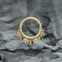 Another of our hand made 316L steel hinged segment rings patiently produced by our steel cluster piercing welders, PVD gold plated, then set with synthetic black pearls. Ideal to be worn as tragus piercing, daith piercing as well as septum piercing.