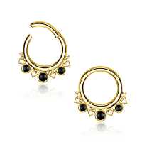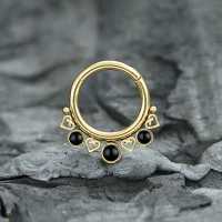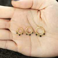 Another of our PVD gold coated 316L steel hinged segment rings masterfully welded by our steel cluster piercing experts using little steel hearts and black onyx cabochons. We always try our best to stick to our vision of creating brand new steel body jewelry designs that can be worn as tragus piercing, daith piercing as well as septum piercing. Welcome to our amazing web shop, the one stop for wholesale steel body piercing jewelry.