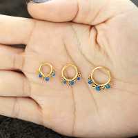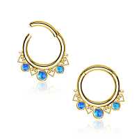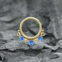 Here we present a PVD gold plated hinged segment rings patiently welded by our steel cluster piercing craftsmen using little steel hearts and synthetic blue opals. As always we are inspired to create our own stunning steel body jewelry designs that can be worn as tragus piercing, daith piercing as well as septum piercing. Welcome to Chaotic Trading, the one stop for wholesale steel body piercing jewelry.