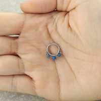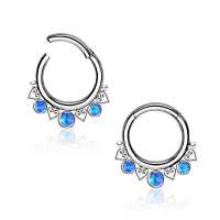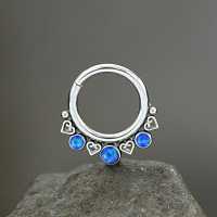 Another of our hand made 316L steel hinged segment rings patiently produced by our steel cluster piercing welders using little steel hearts and synthetic blue opals. As always we are inspired to create more and more stunning steel body jewelry designs that can be worn as tragus piercing, daith piercing as well as septum piercing. Welcome to our online shop, the one stop for wholesale steel body piercing jewelry.