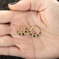 This exclusive to Chaotic Trading PVD gold plated hinged steel segment ring is another good example of true exclusive steel body jewelry innovation. Designed and produced by hand in our steel piercing workshop using custom made steel body jewelry parts and black onyx cabochons. We recommend to wear as septum piercing, tragus piercing or rook piercing to mention a few options.