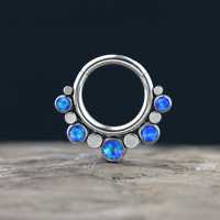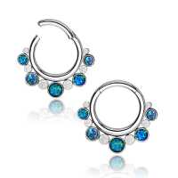 Here is another cool example of true innovative steel body jewelry design. This 316L hinged steel segment ring exclusive to Chaotic Trading, made by hand in our workshop using custom made steel parts and synthetic blue opals. This is perfect to be worn as septum piercing, tragus piercing or rook piercing to mention a few options.