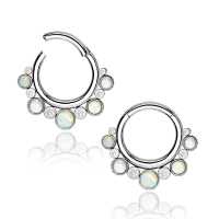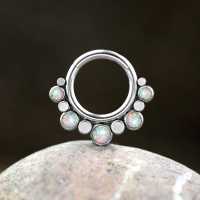 Here is another good example of true innovative steel body jewelry design. This 316L hinged steel segment ring exclusive to Chaotic Trading, produced by hand in our workshop using custom made steel parts and synthetic white opals. This is very great to be worn as septum piercing, tragus piercing or rook piercing to mention a few options.