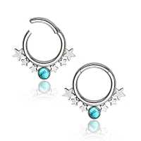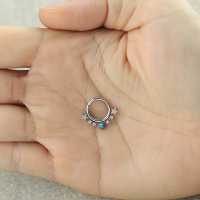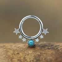 Here is another exclusive Chaotic Trading steel body jewelry. This 316L hinged steel segment ring has been welded by hand in our workshop using custom made steel stars and synthetic turquoise cabochon. These are perfect to be worn as septum piercing, snug piercing or daith piercing to mention a few options.
