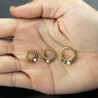 This PVD gold plated hinged steel segment ring piercing, is adorned with a combination of black and white synthetic pearls. Another showcase of innovative steel body piercing jewelry from our extensive wholesale body jewelry collection.