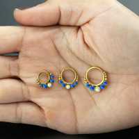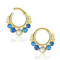 This PVD gold plated hinged steel segment ring piercing, is adorned with a combination of blue and white synthetic opals. Another showcase of innovative steel body piercing jewelry from our extensive wholesale body jewelry collection.