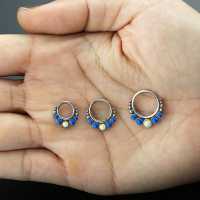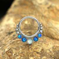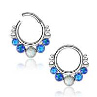 Multi colored hinged steel segment ring piercing, with a combination of blue and white synthetic opals. Another example of great steel body piercing jewelry from our wholesale body jewelry collection.